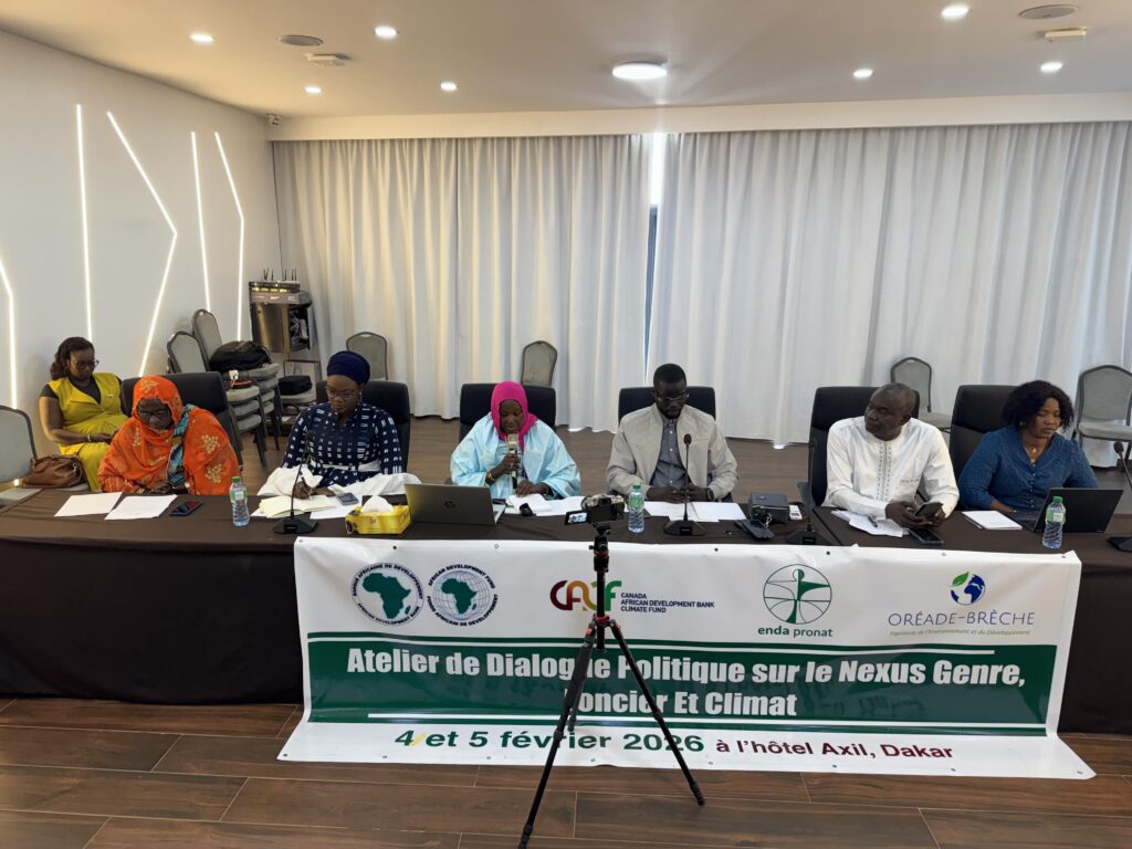 ENDA PRONAT en collaboration OREADE BRÉCHE, a organisé un atelier national de dialogue politique consacré au nexus genre, foncier et changement climatique, réunissant en priorité des leaders communautaires, des organisations paysannes et de femmes, des élus locaux, des représentants des institutions publiques, des parlementaires, des organisations de la société civile, ainsi que des partenaires techniques et financiers.